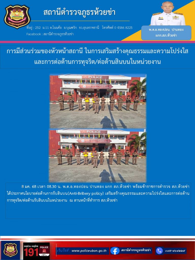 ผกก.ร่วมต่อต้านการทุจริต 8 มกราคม 2568 โดย admin / ข่าวภารกิจผู้บังคับบัญชา,การมีส่วนร่วมของ หน.สภ.,ข่าวภารกิจผู้บังคับบัญชา 8 มค. 68 เวลา 08.30 น. พ.ต.อ.ทองปอน ปานทอง ผกก สภ.ห้วยข่า พร้อมข้าราชการตำรวจ สภ.ห้วยข่า ได้ประกาศนโยบายต่อต้านการรับสินบน(Anti-Bribery policy) เสริมสร้างคุณธรรมและความโปร่งใสและการต่อต้านการทุจริต/ต่อต้านรับสินบนในหน่วยงาน ณ ลานหน้าที่ทำการ สภ.ห้วยข่า Facebook iconFacebookTwitter iconTwitterLINE iconLine