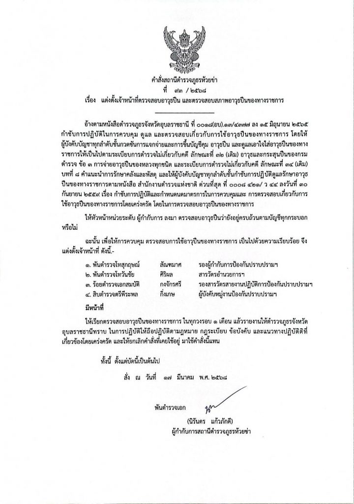 คำสั่งแต่งตั้งเจ้าหน้าที่ตรวจสอบอาวุธปืน และตรวจสอบสภาพอาวุธปืนของทางราชการ