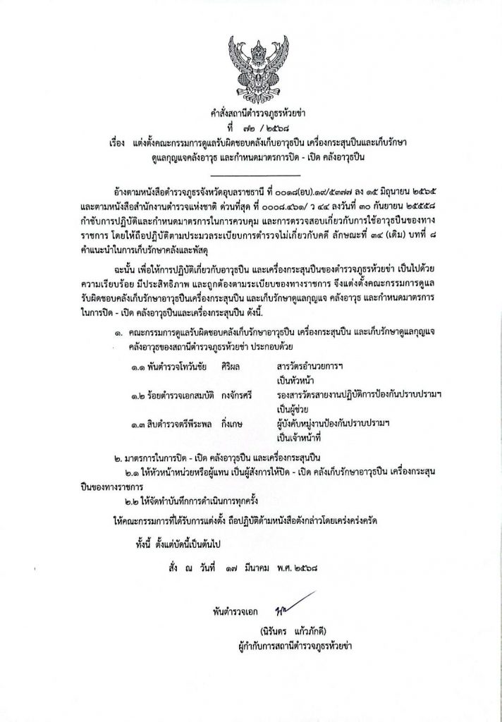 คำสั่งแต่งตั้งคณะกรรมการดูแลรับผิดชอบคลังเก็บอาวุธ เครื่องกระสุนปืนและเก็บรักษากุญแจคลังอาวุธ และกำหนดมาตรการเปิด-ปิด คลังอาวุธปืน